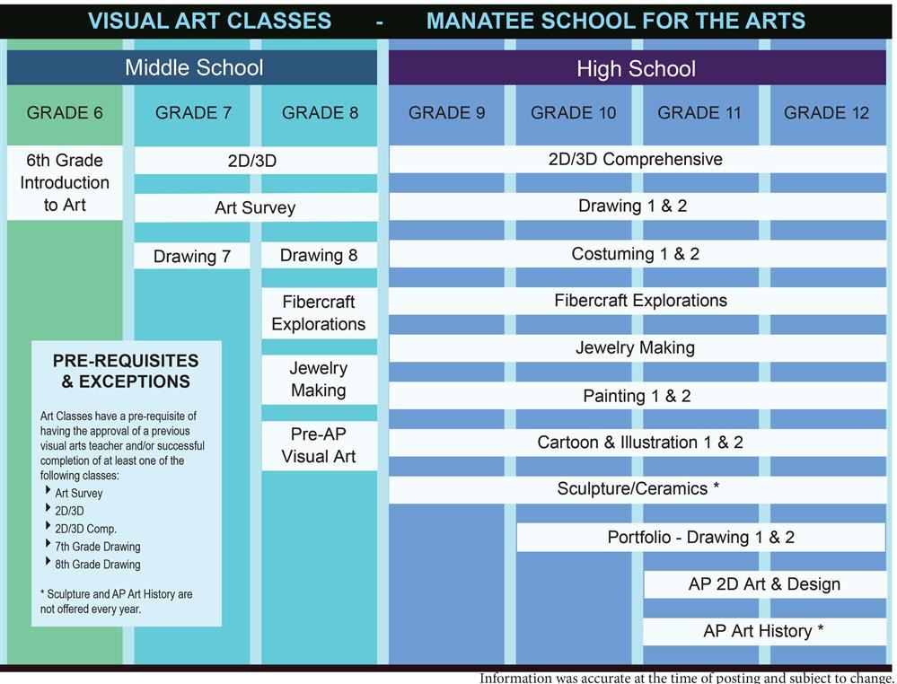 The Visual Arts Department at Manatee School For the Arts provides something for everyone! Introductory classes for new students or those without prior arts training, at both the middle and high school level, offer the chance to learn the fundamental concepts inherent in all higher level classes. Multiple levels of classes are offered throughout the curriculum in several disciplines, including drawing, painting, cartooning, as well as fine craft areas, such as sculpture, jewelry making, fiber exploration and costuming. Pre-Advanced Placement (Pre-AP) in eighth grade and Advanced Placement (AP) in high school as well as portfolio classes are available and encouraged for students seeking further study in college in the Visual Arts field as preparation for applying to a college level program.